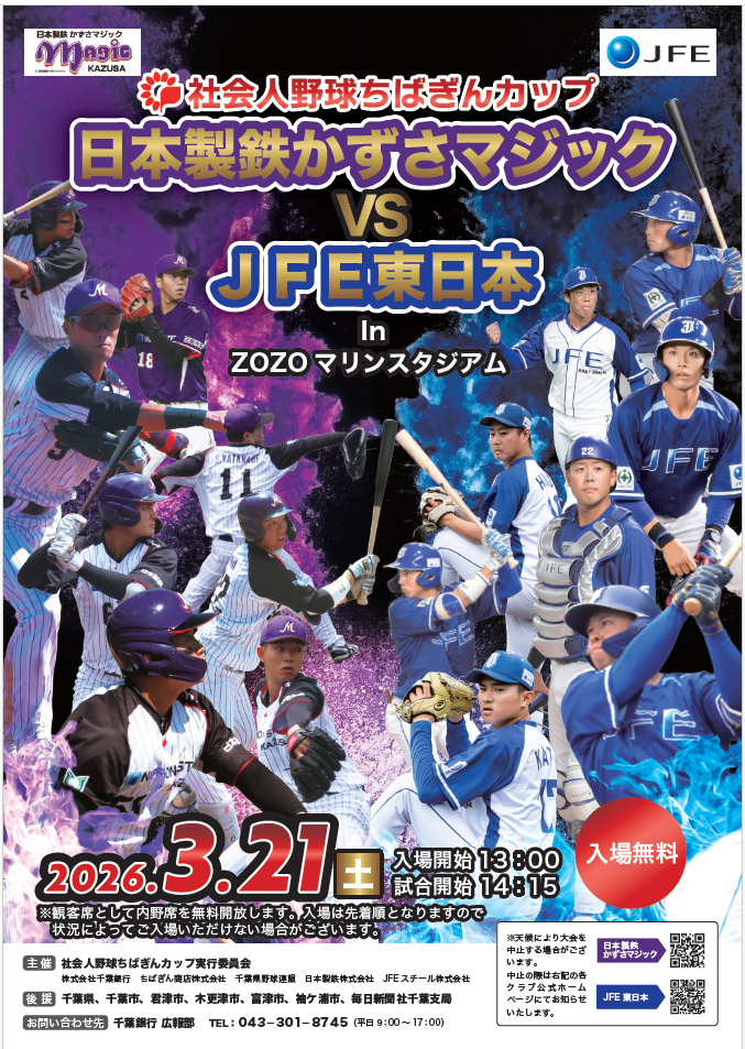 大会詳細は、こちら(「社会人野球ちばぎんカップ」を初開催!~ 日本製鉄かずさマジック vs JFE東日本 ~)をご覧ください。